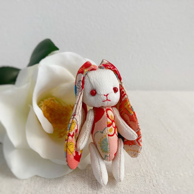 ちりめんや着物のハギレで作った、ハンドメイドのぬいぐるみです。 新作!ふんわりたれ耳の白うさぎさんです。 渋い赤色のお耳には、華やかな朱・金色の梅や菊が咲いています。 きゅっとしたお口が可愛らしい子です。 梅や菊は縁起の良い花とされており、新しい年を祝うお正月にもぴったり。 おめでたい装いのうさぎさんと一緒に、明るい新年をお祝いしませんか。 お好きな場所に飾ったり、一緒にお出かけを楽しんだり。たくさんの思い出を作ってもらえると嬉しいです。 手足は動かすことができます(自立はできません)。お座り時も、後ろに支えがあると安定します。 サイズ 約 6.5 センチ ⚫︎お買い物の前にショッピングガイドを、ご一読くださいませ。 【お取り扱いについて】 手足は糸で繋いでいます。強い力がかかると破損の原因になります。優しく、動かしてあげてください。 この作品はインテリア雑貨です。お子様のいらっしゃるご家庭では保護者の方の管理の元、お取り扱いください。 【発送時期について】 入金確認後、通常3〜5営業日後(土日祝日は除く)に発送いたします。 ⚫︎年末年始やGW、夏季休暇などの長期休暇中ならびにその前後のご発注については、発送が遅れることがございます。 ⚫︎繁忙期や天候、交通状況により発送が遅れることがございますので、あらかじめご了承ください。 【返品・交換について】 配送中の破損や初期不良、またはご注文の作品と違う作品が届いた場合、到着後5日以内に、ご連絡ください。対応させていただきます。 なお、返品が承れない場合もございます。詳細は、ショップ内ブログの「ご利用ガイド」記事の【返品・交換について】の項を、ご一読ください。 ※お使いの端末や閲覧環境により、写真と実物の色味や質感が多少異なって見えることがございます。 ※撮影に使った小物は付属しません。