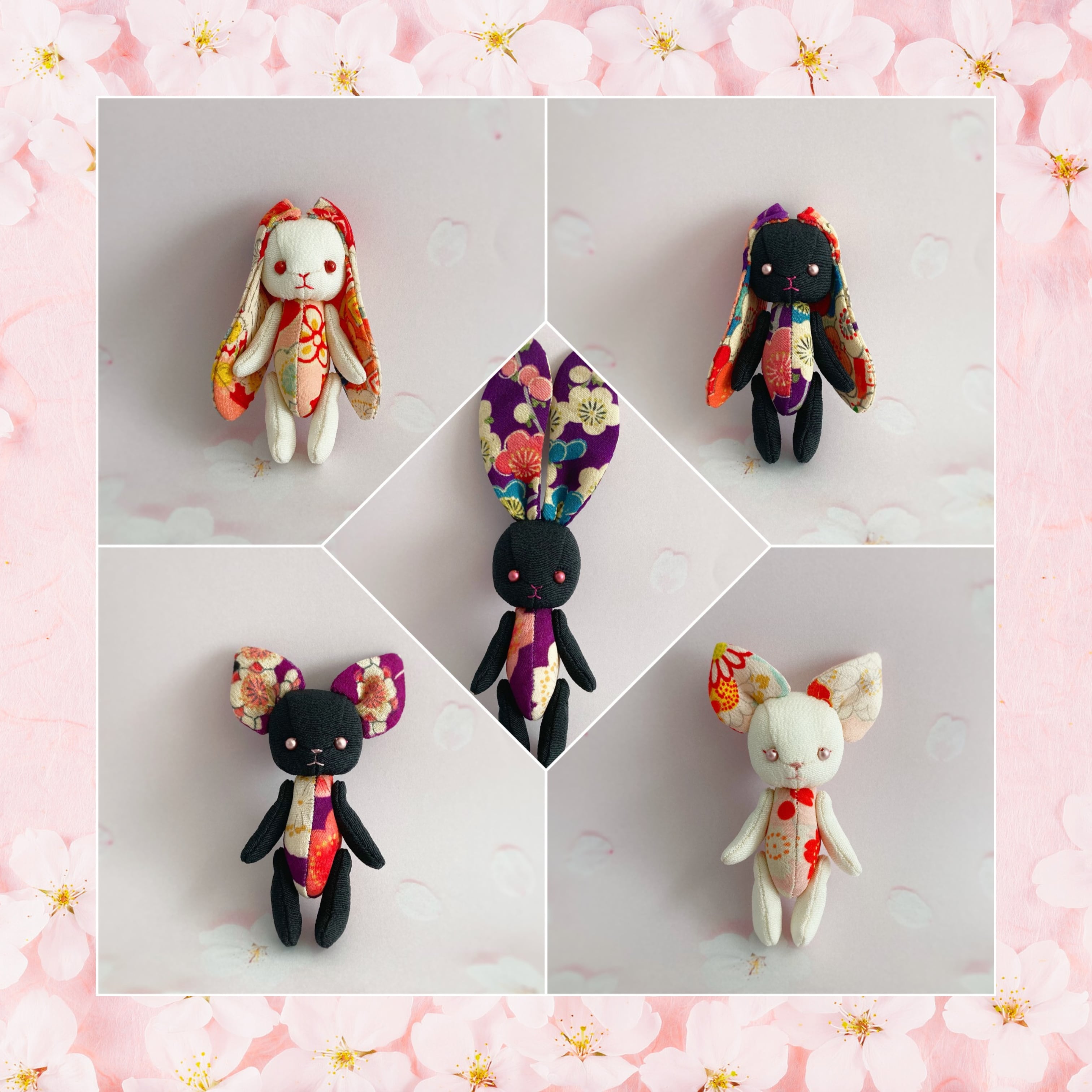 ちりめんや着物のハギレで作った、ハンドメイドのぬいぐるみです。 黒地に紅白梅の柄が特徴的な、黒うさぎさんです。 お耳には梅と菊が咲いています。 左右で少し雰囲気が変わる子になりました。 赤いお目々の、可愛らしい表情の子です。 お好きな場所に飾ったり、一緒にお出かけを楽しんだり。たくさんの思い出を作ってもらえると嬉しいです。 手足は動かすことができます(自立はできません)。お座り時も、後ろに支えがあると安定します。 サイズ 約 6.2 センチ ⚫︎お買い物の前にショッピングガイドを、ご一読くださいませ。 【お取り扱いについて】 手足は糸で繋いでいます。強い力がかかると破損の原因になります。優しく、動かしてあげてください。 この作品はインテリア雑貨です。お子様のいらっしゃるご家庭では保護者の方の管理の元、お取り扱いください。 【発送時期について】 入金確認後、通常3〜5営業日後(土日祝日は除く)に発送いたします。 ⚫︎年末年始やGW、夏季休暇などの長期休暇中ならびにその前後のご発注については、発送が遅れることがございます。 ⚫︎繁忙期や天候、交通状況により発送が遅れることがございますので、あらかじめご了承ください。 【返品・交換について】 配送中の破損や初期不良、またはご注文の作品と違う作品が届いた場合、到着後5日以内に、ご連絡ください。対応させていただきます。 なお、返品が承れない場合もございます。詳細は、ショップ内ブログの「ご利用ガイド」記事の【返品・交換について】の項を、ご一読ください。 ※お使いの端末や閲覧環境により、写真と実物の色味や質感が多少異なって見えることがございます。 ※撮影に使った小物は付属しません。