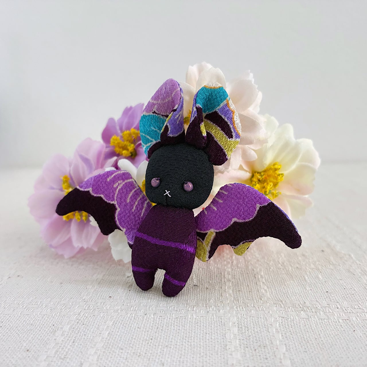 あやめ色の美しいお花をまとったこうもりさん。